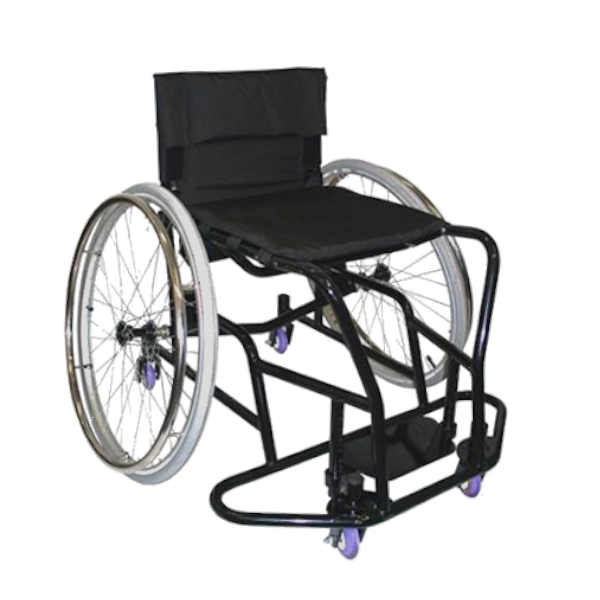 A custom made, adjustable basketball wheelchair. Ideal for development level play at schools, rehabs, sports clubs etc. Can also be used for other court sports such as wheelchair tennis, soft ball or hockey. Made to measure to suit the users functional needs in their chosen sport.